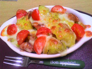 これは一昨日の晩つくった「インカのめざめとウインナーとミニトマトのチーズ焼き('∇')」